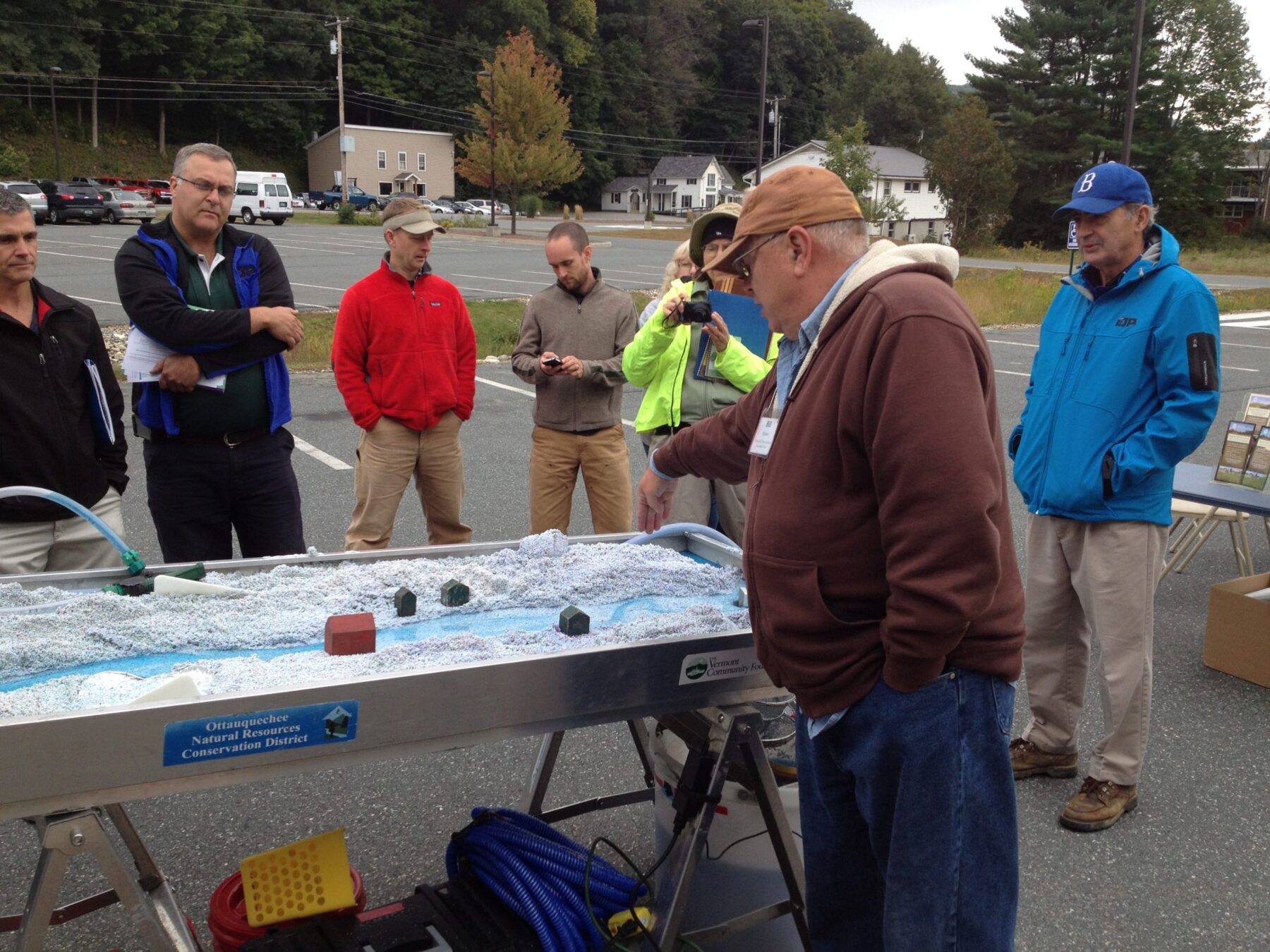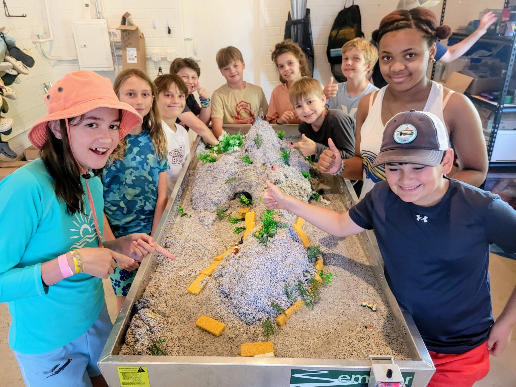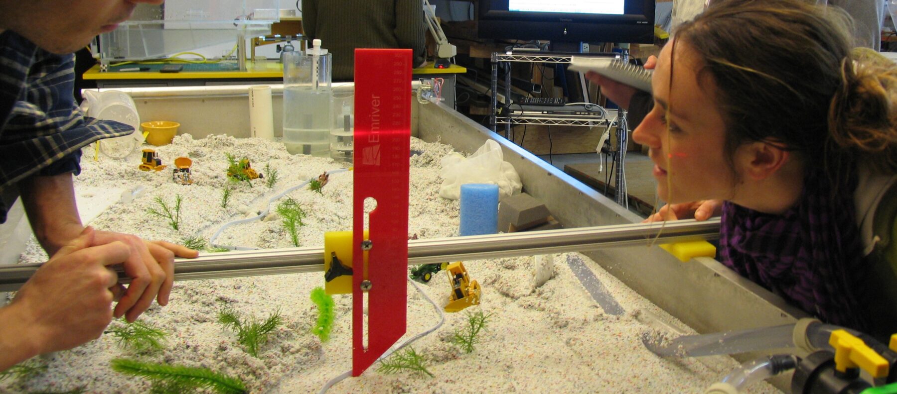 Unlike table-top stream tables, the Em2 is large enough to model a full range of fluvial phenomena such as meanders, oxbows, and delta formation. Our Em2 stream table is also engineered for portability: it stores in as little as three feet square of closet space and can be quickly set up in a classroom by a single person. You can also transport the stream table for on-location teaching with a small pickup truck or SUV and power it with a 12V marine battery. Despite its compact size, the Em2 can easily accommodate 10 hands-on learners plus a teacher. Adding a second row of observers can allow a whole class to gather at the stream table. The Em2 is very popular with elementary through high schools, nature and conservation centers, and colleges.