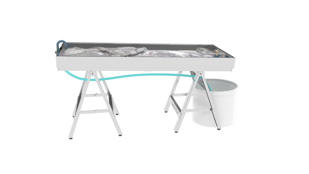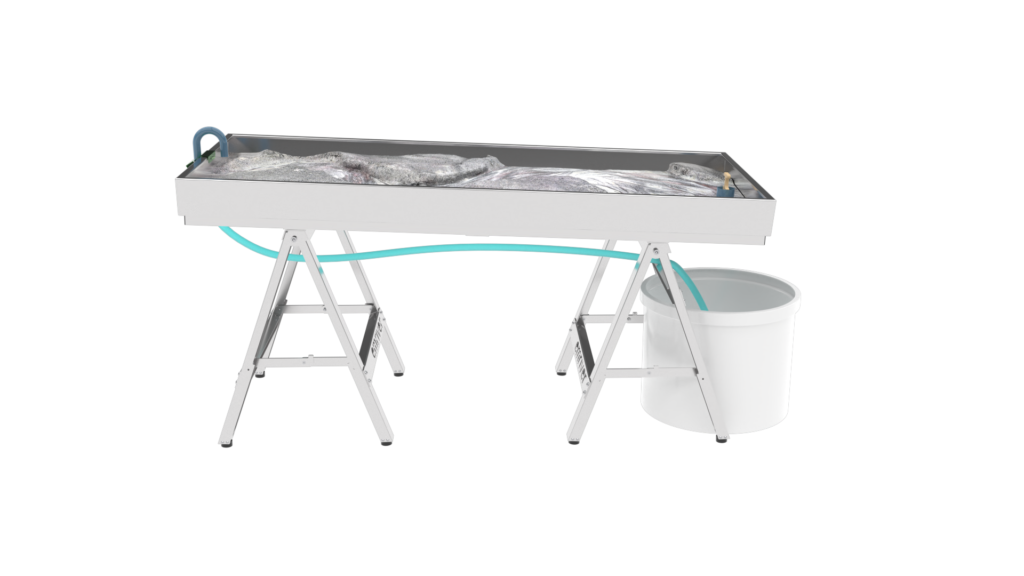 Can be powered with a deep-cycle 12V battery. Can be stored in one square meter of floor space. Easily transported on a compact SUV or pick-up truck.