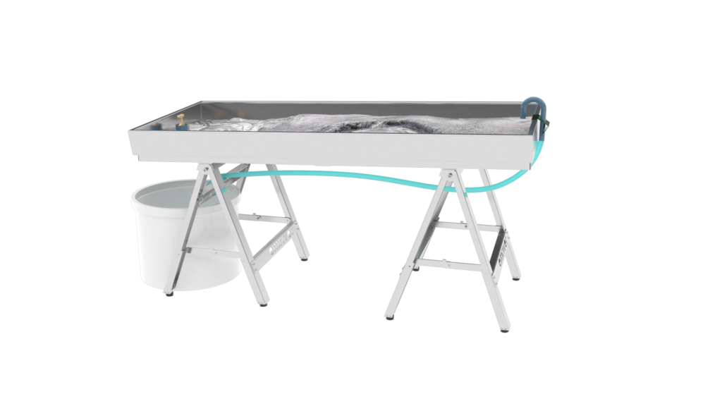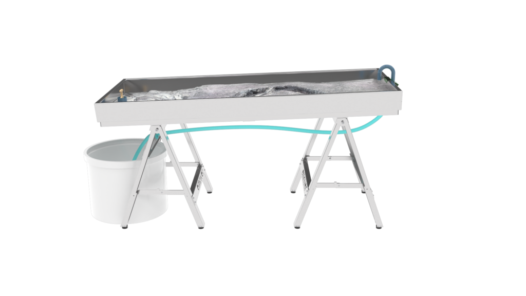 All of the standard instruments and accessories fit into the single, 27-gallon reservoir for storage or transport, and it is easy to fill the model with a garden hose or 5-gallon buckets from a utility sink. The included pump will drain the system in less than 5 minutes and can be used to rinse out the model after removing the media. The Em2 comes with heavy-duty engineered aluminum folding stands that create a standard box slope of 3.5 percent (2 degrees). The slope can be lowered by putting an additional block under the downstream end of the table, and by raising the standpipe.