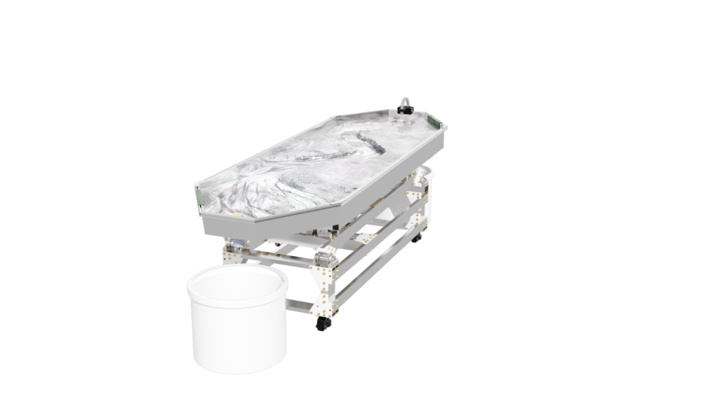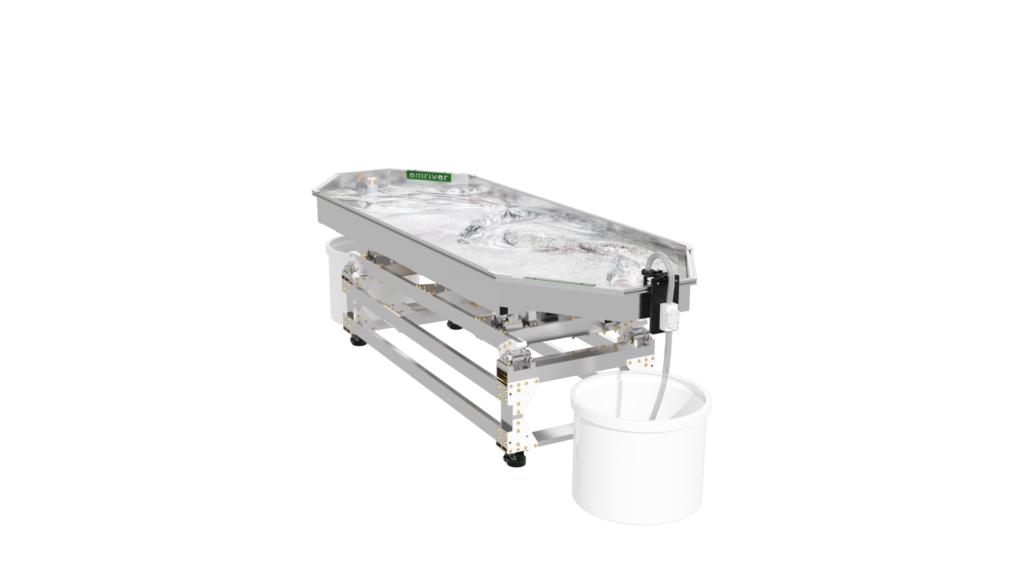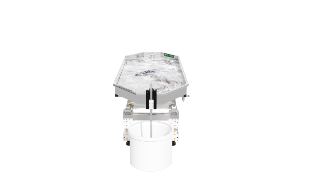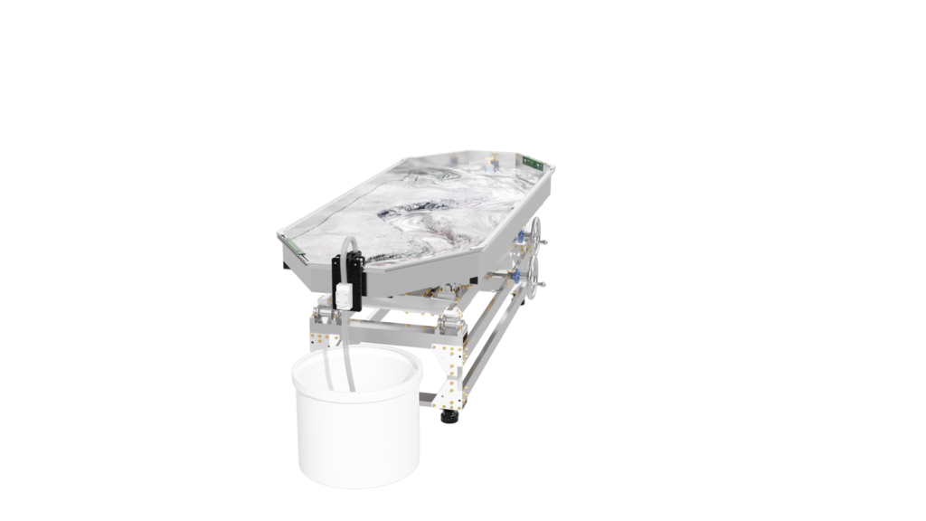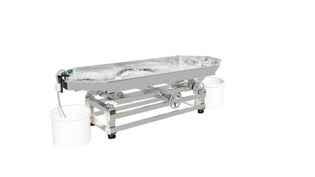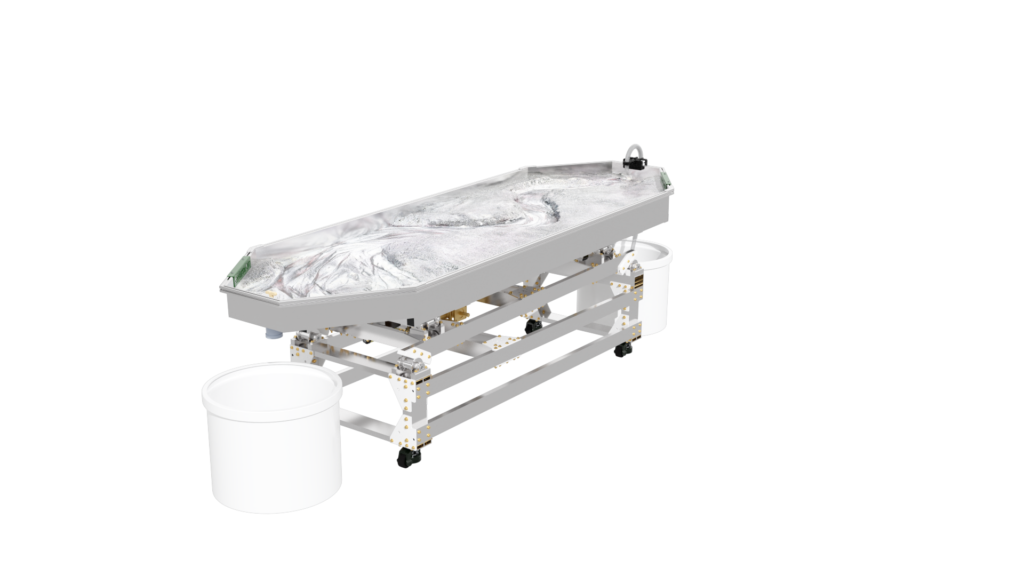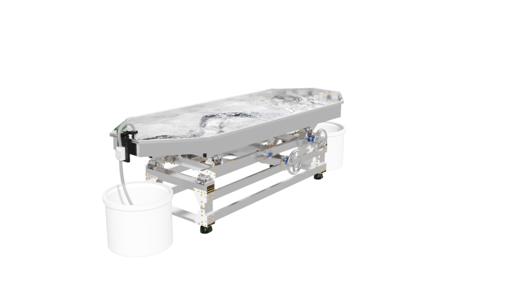 The standard static supports are engineered from high-strength aluminum and create a box slope of 3 degrees or 5%. Decreasing the slope is as simple as raising the standpipe water level or inserting a support under the table’s downstream end.