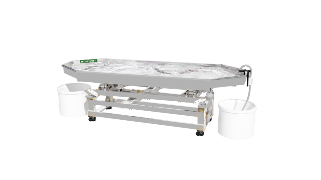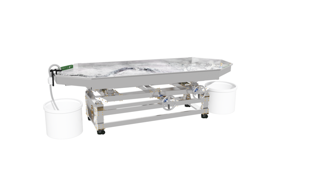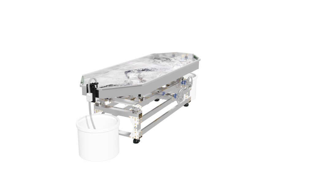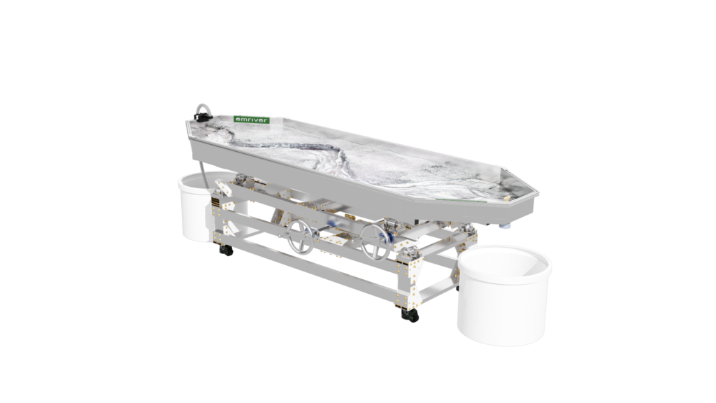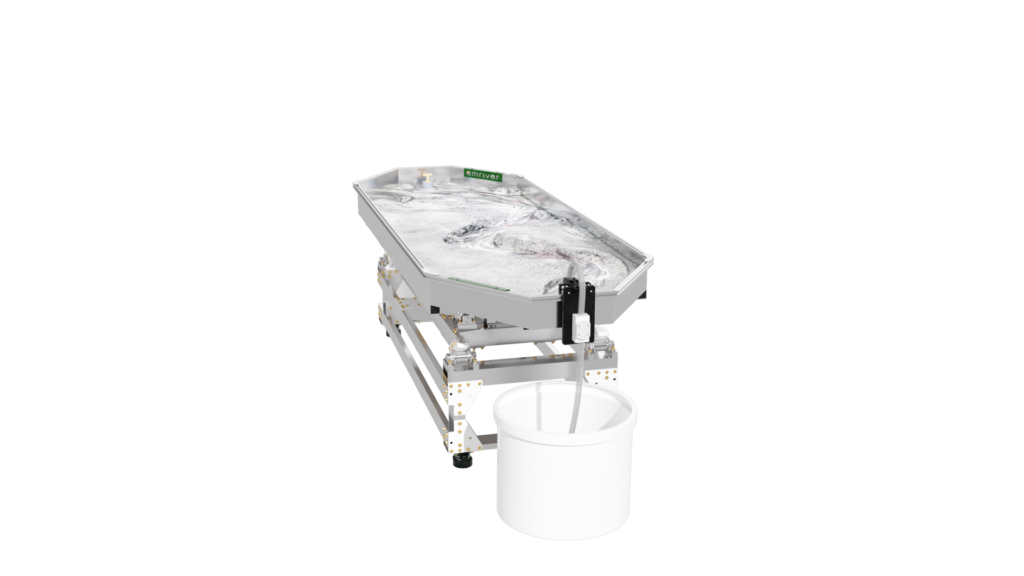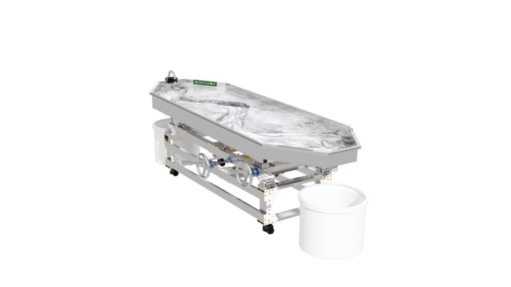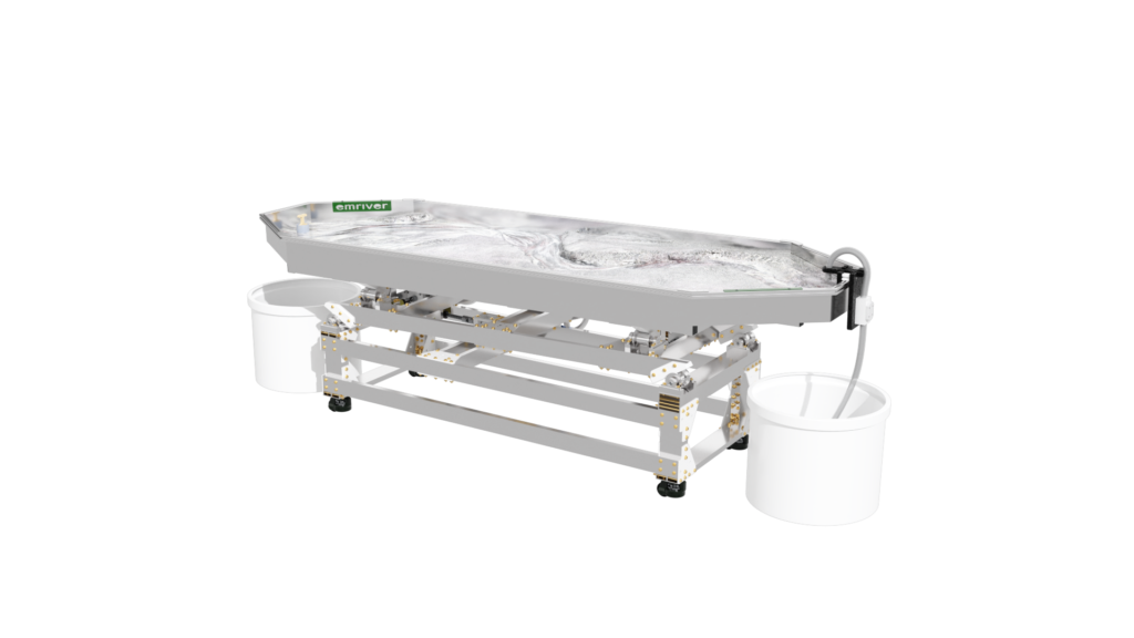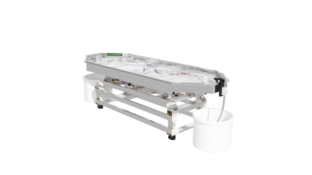 The standard static supports are engineered from high-strength aluminum and create a box slope of 3 degrees or 5%. Decreasing the slope is as simple as raising the standpipe water level or inserting a support under the table’s downstream end.