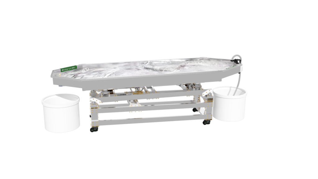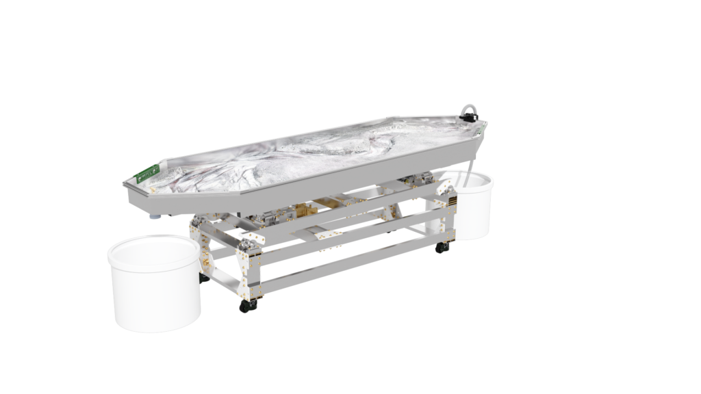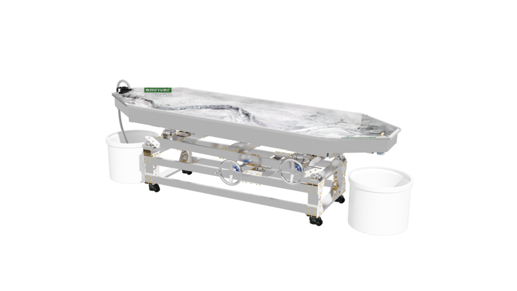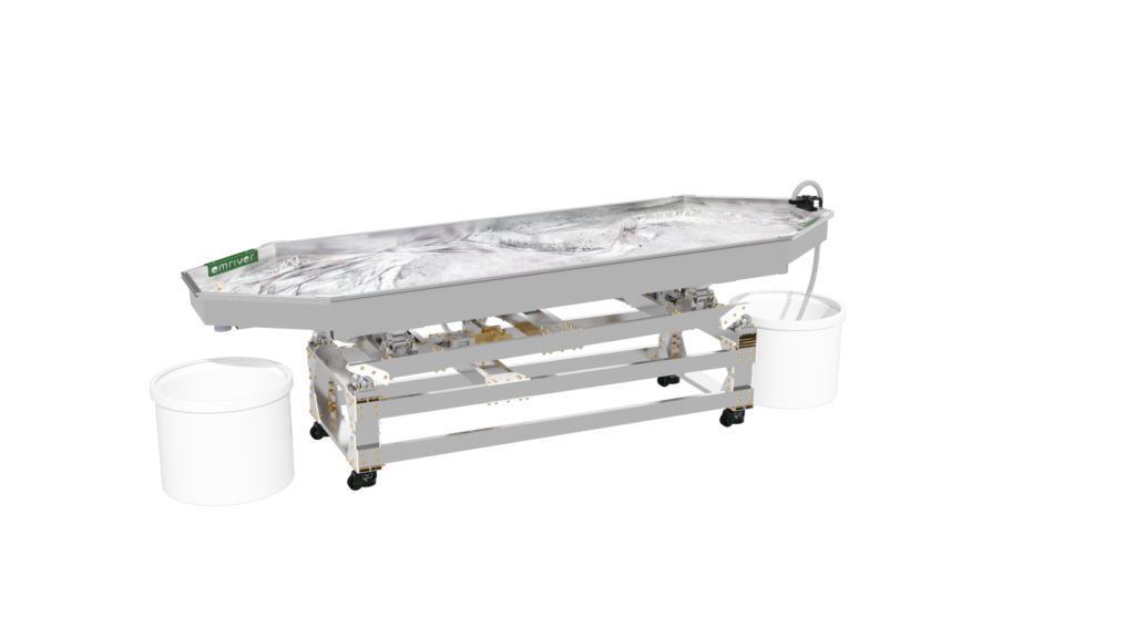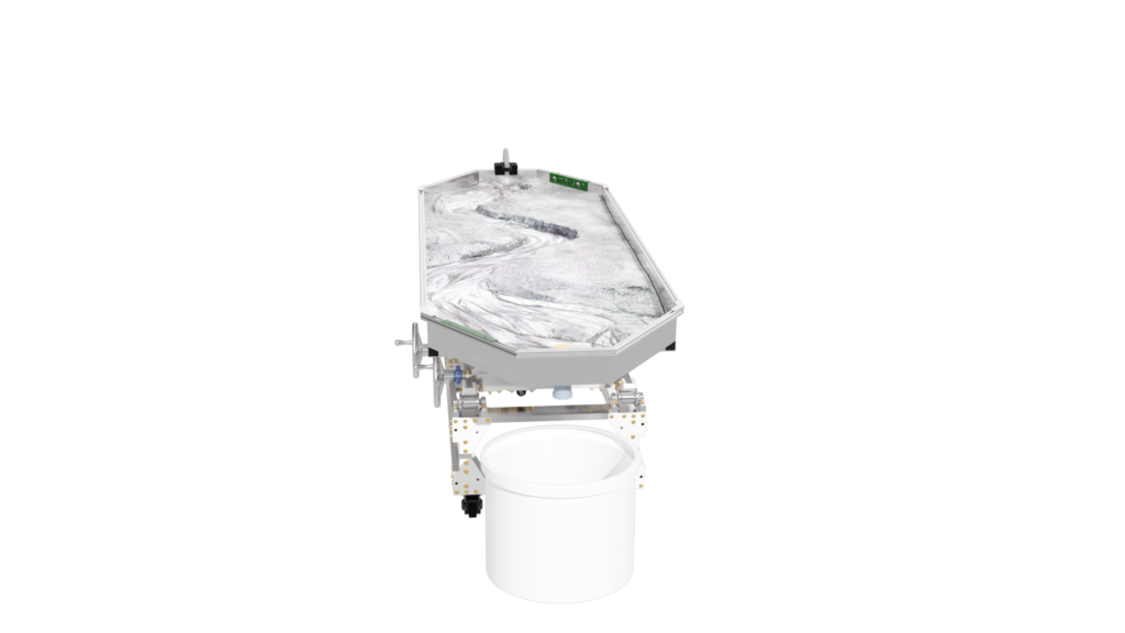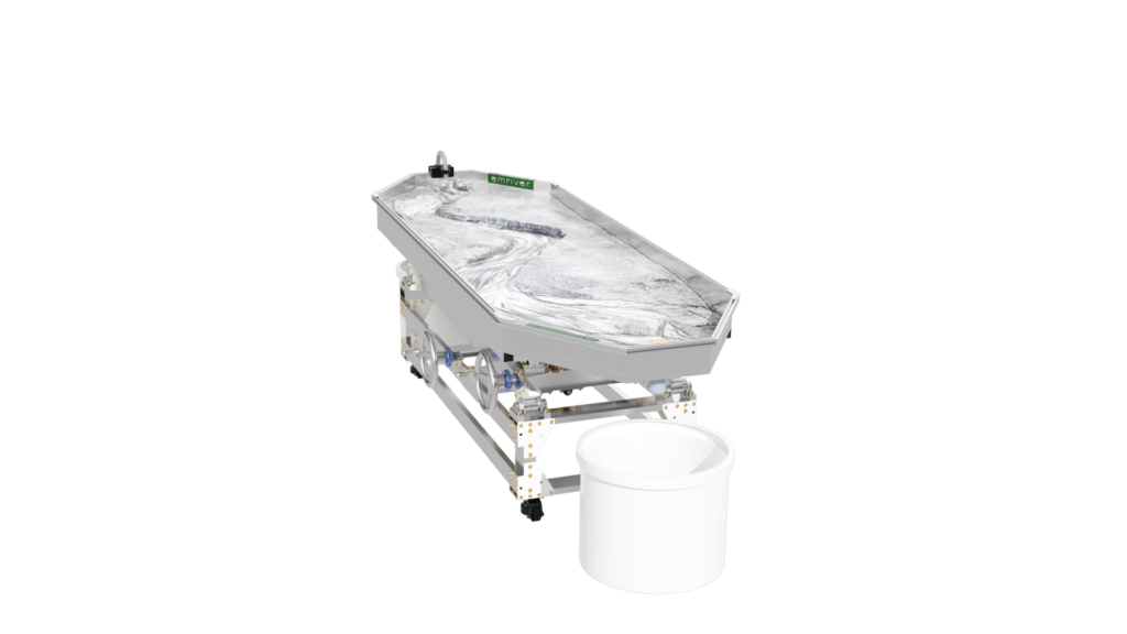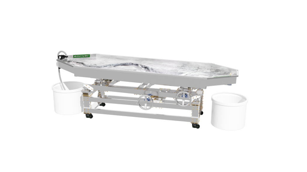 The standard static supports are engineered from high-strength aluminum and create a box slope of 3 degrees or 5%. Decreasing the slope is as simple as raising the standpipe water level or inserting a support under the table’s downstream end.
