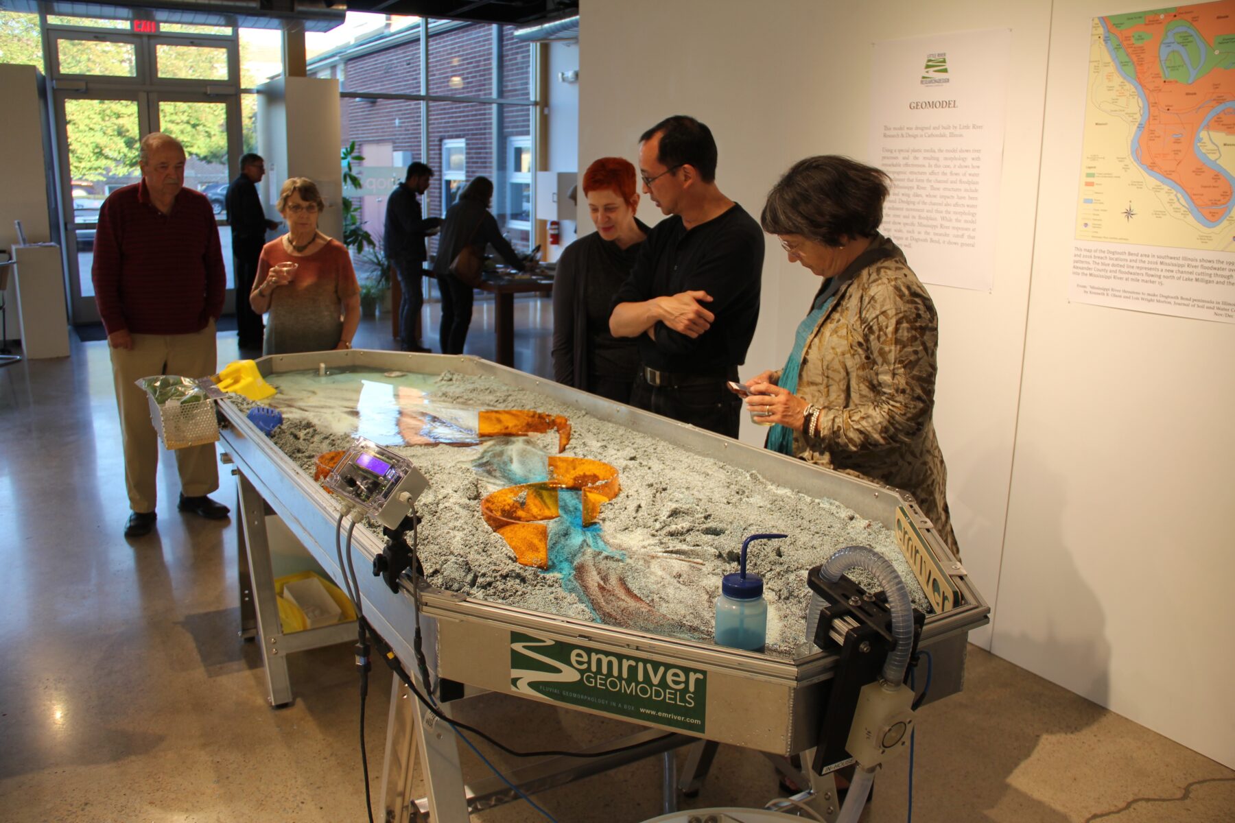 We have used the Emriver Em3 fluvial geomodel to demonstrate a variety of processes and resulting morphologies to undergraduate students. We’ve demonstrated different channel types, channel migration, point bar development and cut banks, meander cut-offs, erosional terracing, knickpoint migration, channel incision, delta development, the effects of base level on the depocenter, and delta-lobe switching. Overall, this geomodel has been a very useful educational tool to provide a visual example for some basic concepts of fluvial and deltaic geomorphology.