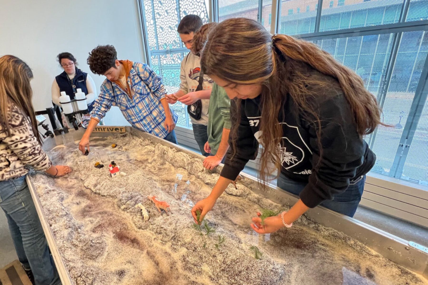 A class of 15 plus a teacher or facilitator can participate with the Em3, with a second row of 15 observers, so it’s a perfect choice for hosting school groups and field trips. The Em3 stream table is designed to be set up and put away by two people, and can be transported in a full-size pickup or cargo van for outreach and education events. It can also be powered onsite by a 12V marine battery. The Em3 stream table is popular with high schools that have dedicated geology labs, colleges, nature centers and museums, and universities.