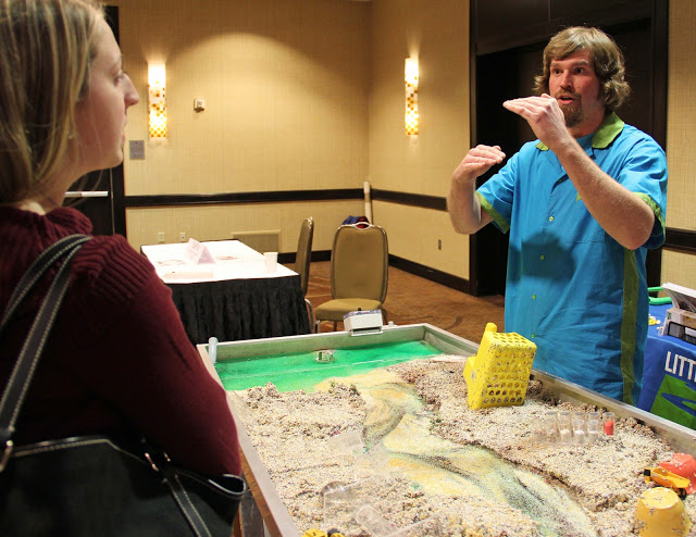 But we’ve had a great meeting.  We’ve met students and professors, state agency representatives, and professionals young and old.  We even met a young scientist — a professor’s ten-year-old daughter — who spent some time with us last night armoring stream banks in our model.A meeting organizer told me at the cocktail reception last night that we’re the talk of the conference.