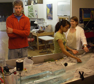 And here’s a photo of Lizette Chevalier, civil engineering faculty at SIUC, with her daughter Rosa and a grad student she brought by this week. We’re hoping to work on river modeling research. I was very happy to see both the grad student and 11-year-old have a lot of fun with our lab model, thanks Lizette.