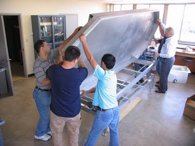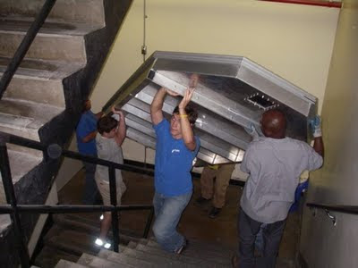 The model sits on the third floor of Maclwane Hall, with a beautiful view to the east and north, including the Arch. Despite the three story climb for the 4m x 1.5 meter box (bottom photo) the installation went without a hitch.