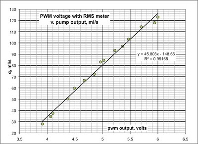 So after the proposal was done (hardest part was the budget, is it always like that?) we ran into the shop and simply hooked a PWM unit and voltmeter up to a pump. Measuring flow volumetrically (stopwatch and graduated cylinder) we produced this beautiful curve. It’s even straight!