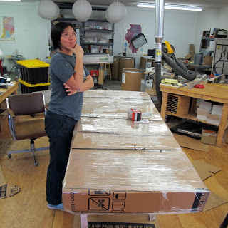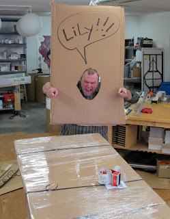 Here Lily strikes what she described as a “serious pose” with a ready-to-ship UPS-able Em2, and I have some fun with cardboard by way of thanking Lily and everybody else around me for so much support and probably a lot of tolerance.