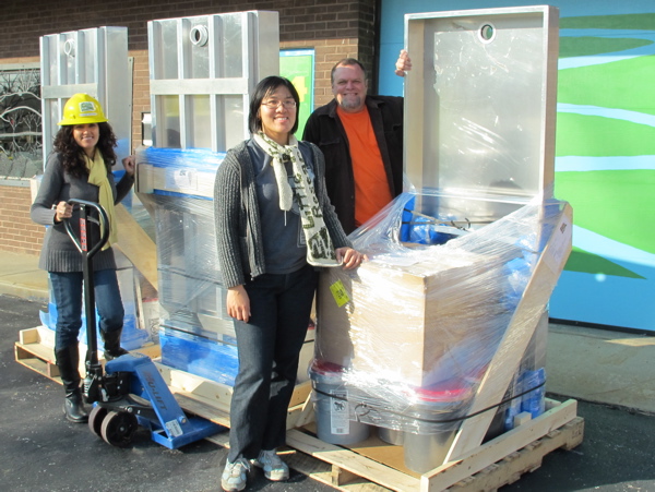 Here you see our amazing crew shipping three Em2s in one day, a new record for us. Meriam Lahlou in the hardhat (very funny Meriam), Lily Hwang, and me.