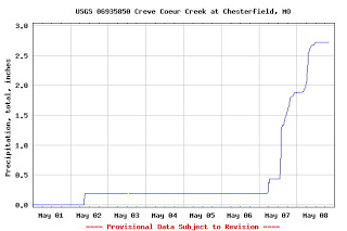 As you can see from the rainfall chart, the storm had fizzled. Not much rain fell today, but that 0.6″ on top of the previous day’s 1.5″ to 2″ was enough to send many of the St. Louis creeks to a second very high flow. Catching these floods is hard. It’s especially frustrating when they peak at night. This one happened in broad daylight, while all my gear sat ready to go.