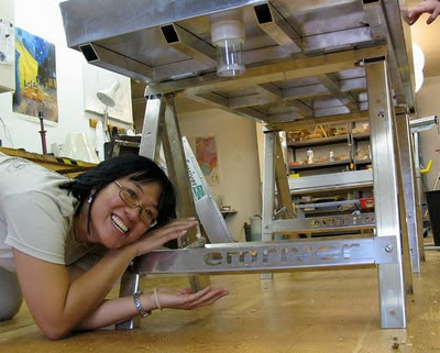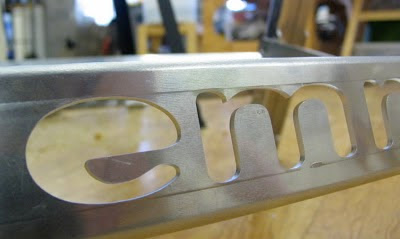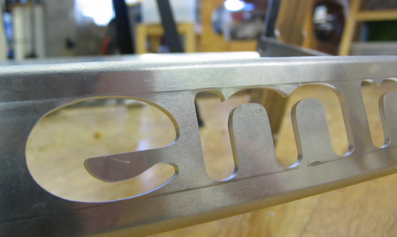 The “horses” as we call them are beautiful; made from bent 1/8″ aluminum, they weigh only 8 pounds (3.6 kg) each. The parts are laser-cut, complete with an aluminum-friendly “emriver” logo design by Lily.