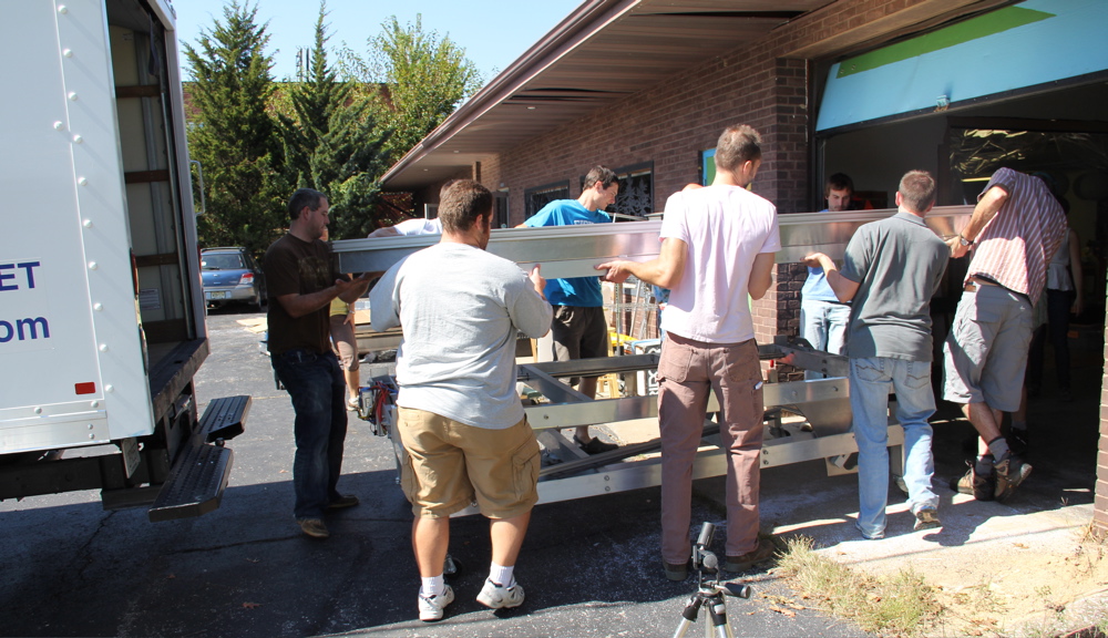 SIUC students from all over campus formed human forklifts to muscle the big Em4 on board.