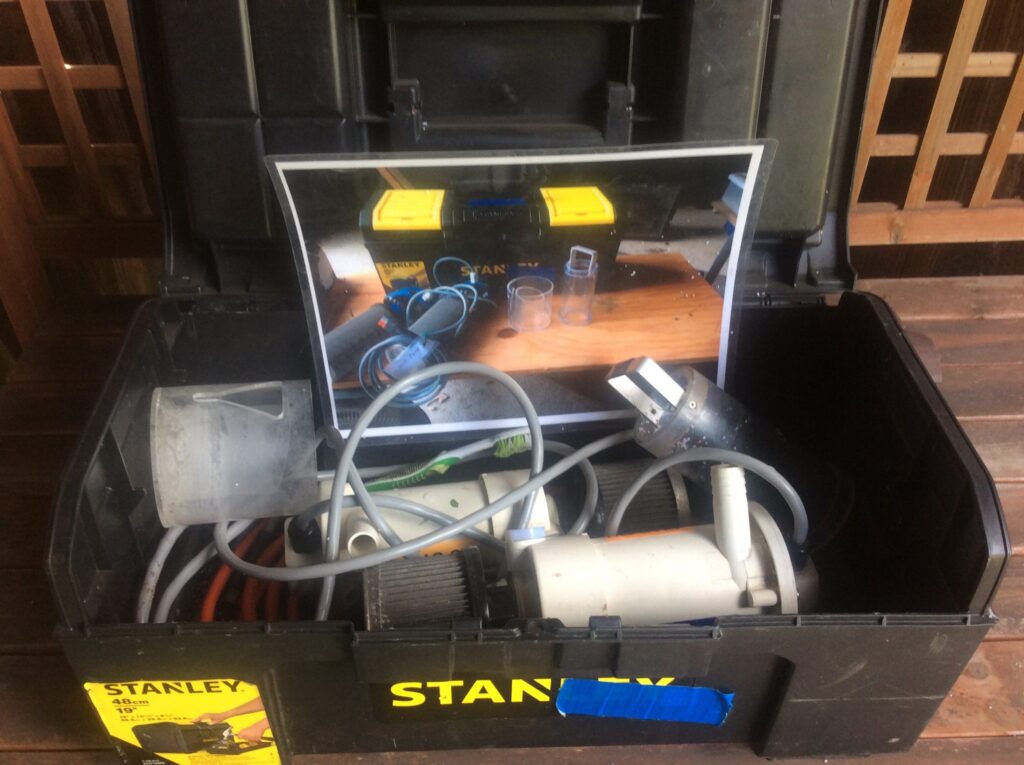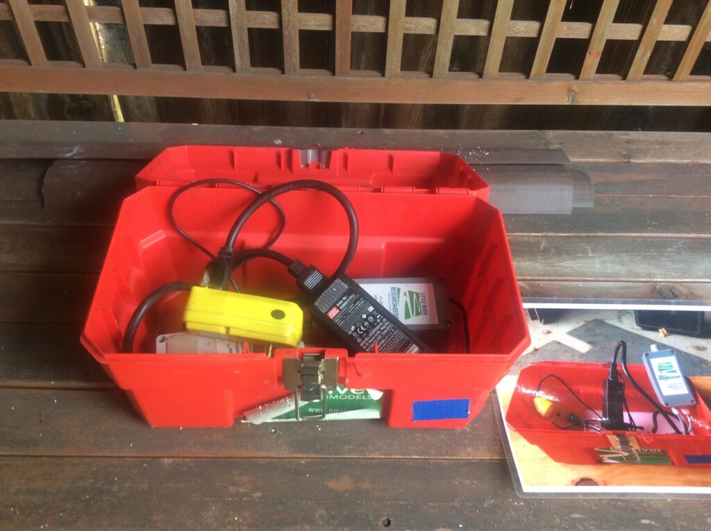 A couple of plastic toolboxes hold the controllers and pumps. Laminated photos of what goes in each toolbox are included in each toolbox. The red toolboxes you see are what we at Little River send with our stream tables.