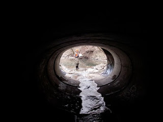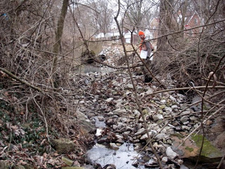 It was cold, and we broke ice most of the time, surveying nearly a mile of creek. We went underground, and there encountered a sewage spill–this municipality has a combined stormwater/sanitary system. These are being phased out for good reason.