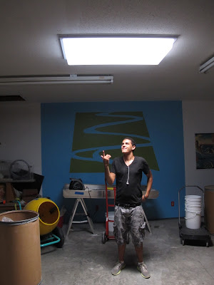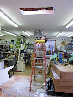 Above, you see us having great fun with the light that formerly bounced unused off our roof, and Baine Roofing guys getting fluvial geomorphology schooling from Alee. Below, a glimpse of Amish workers (who asked their likeness not be published) installing the lights.