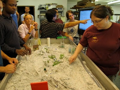 And we hosted an SIUC watershed science class; this was a blast;students ran long profiles in the model (which we plotted real time on the monitor you see) and, by accident, built some very effective grade control stuctures. A cool learning experience.