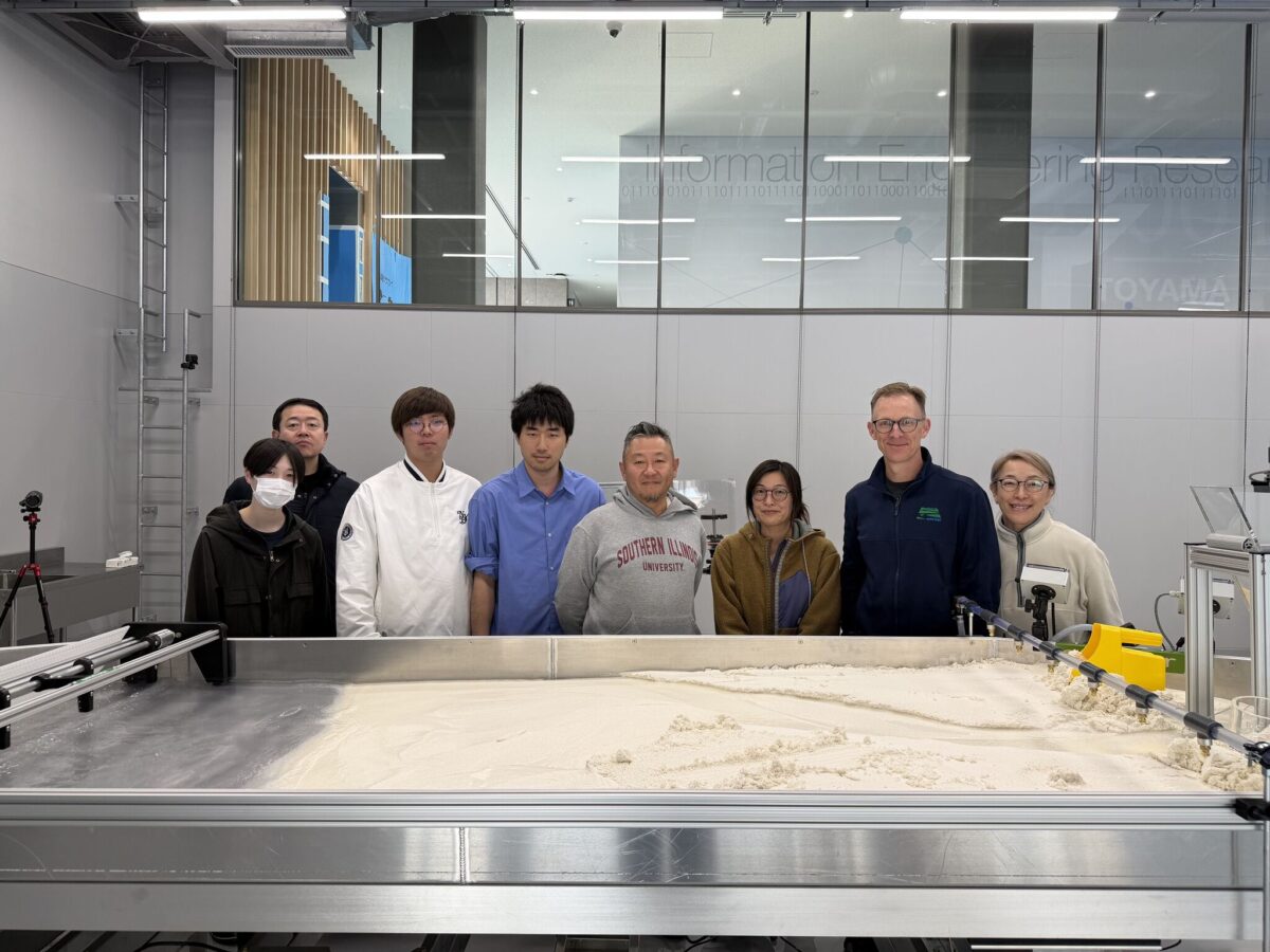 In the photos you can see Dr. Kyuka and Dr. Kure looking at the EmFlume1.5 while students examine a meander in the Em4. (Only white sediment so far; Dr. Kyuka wanted to observe one particle size first. Red, black and yellow will be added later.)