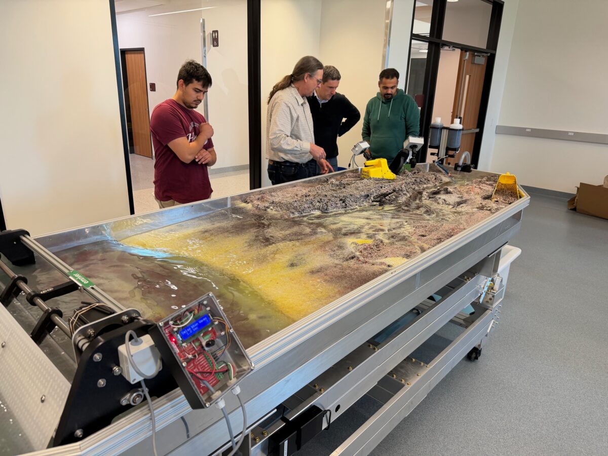 Jim and Steve are just back from Galveston, Texas where they delivered an Em4 with a Wave Maker and Dye Injector to Texas A&M’s campus there. The Galveston campus is home to all their water-related departments, and they have just completed a new building for Ocean Engineering. The Em4 will be a big part of their great teaching in Coastal Geomorphology.